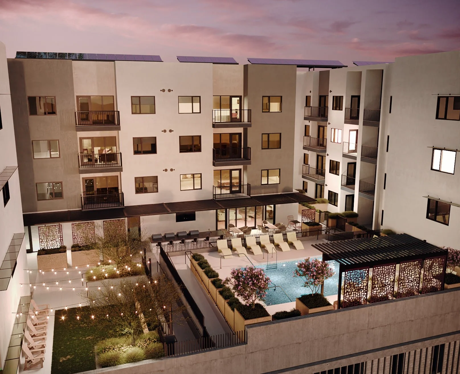 situated in Downtown Phoenix's arts district, is recognized as one of Arizona's most sustainable living environments. This solar-powered community offers studio, one-, and two-bedroom apartments, each designed with high-efficiency appliances and Low-E windows to minimize energy consumption. Amenities include a rooftop pool and spa, a state-of-the-art fitness center, and on-site electric car charging stations, all within walking distance of Roosevelt Row's vibrant arts scene.